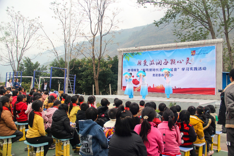实践团还赴蔡森坝完全小学开展了“志愿服务·爱心传递”活动。通过爱心捐赠仪式把PA视讯官网师生自愿捐赠的文具、书籍等物资送给每一位小朋友,实践团成员还为孩子们分享了海外游学经历、科普了新冠肺炎病毒知识,还带去了舞蹈、朗诵、书法、小提琴等节目表演。实践团成员用真诚和关爱温暖了每一颗乡村孩子稚嫩纯朴的心灵。