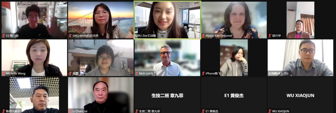 交流环节,2021级四个专业学子们踊跃提问,就赴西澳大学学习的要求、专业课程体系、实习机会、就业前景、学生服务以及专业具体问题与老师积极交流。学院已赴澳的海外学生,用视频的方式与学弟学妹们分享他们在澳大利亚丰富多彩的学习生活,鼓励同学们选择适合自己的学习方式。