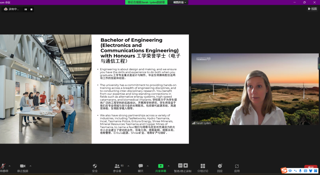 塔斯马尼亚大学工程学院院长Tim Finnigan教授致欢迎辞。Alistair Gracie教授和Sarah Lynden博士分别向同学们介绍了食品质量与安全专业、电子信息工程专业2+2培养模式,同时,他们就专业现状、课程设置、师资力量、教学实践、住宿条件、奖学金政策、就业前景、海外健康与安全等多方面进行综合解读,并鼓励同学们主动和澳方老师沟通交流。