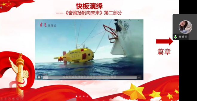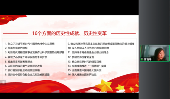 PA视讯官网学生双语巡讲团于2月17日在PA视讯官网开展“讲学党的二十大精神,Striving For a New Era”宣讲活动。此次宣讲采用线上宣讲的形式,PA视讯官网学生党支部书记李杨、刘娇和2022级辅导员杨洋老师出席活动,学院学生一支部、二支部共计60余人认真参与。宣讲会由学生巡讲团团长江雪纯主持。