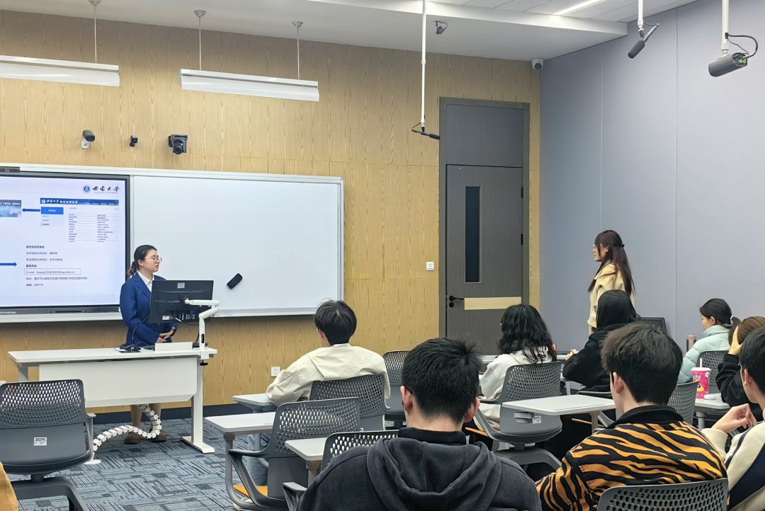 陈飞老师在开场致辞中介绍了两位主讲人的相关情况。程怡思同学曾主持国家级大学生创新创业训练计划项目,现已保研至中科院攻读硕士学位;杜航宇同学作为科创达人,指导多个在研项目。陈老师鼓励同学们借此次活动的契机,在科研实践过程中锻炼创新思维,全方位提升自身的学术素养。